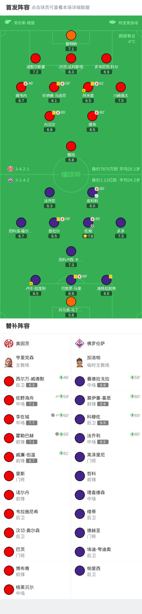 美因茨2-1逆转佛罗伦萨,李在城替补传射,霍勒巴赫破门